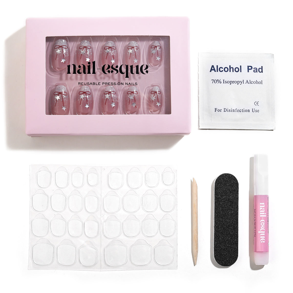 24-30 nails, nail glue tube (for longer 2-3 weeks use), 2x set of adhesive tabs (for shorter 4-7 days use), nail file, cuticle stick, alcohol wipe.