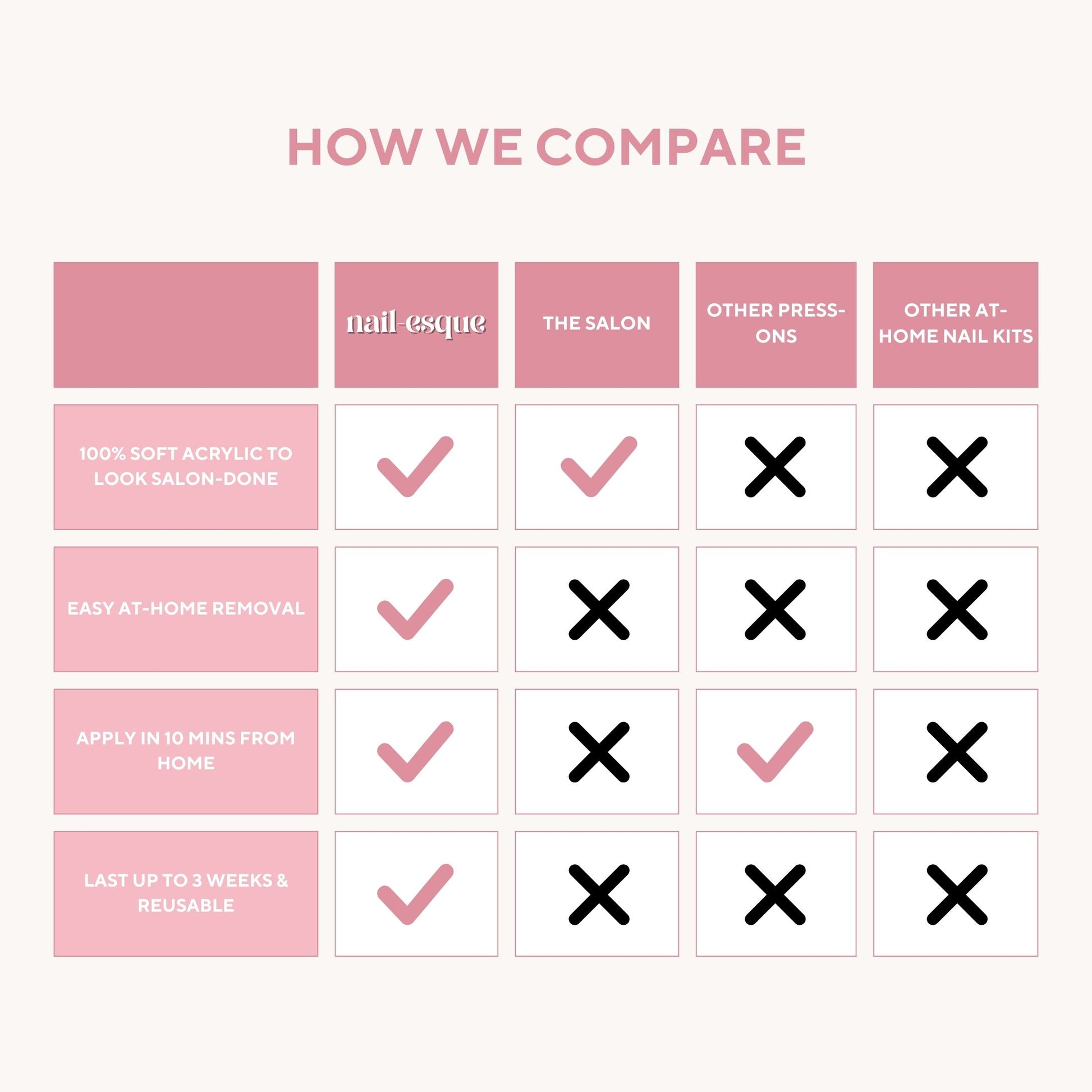 We have developed custom-made moulds that create stronger press-ons than the moulds used by other brands. While most press-ons are made with ABS plastic, our nails are made with 100% soft acrylic to achieve a salon-done look.